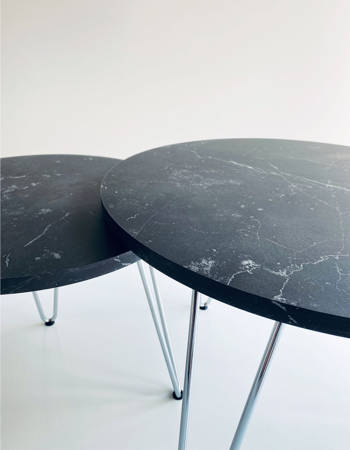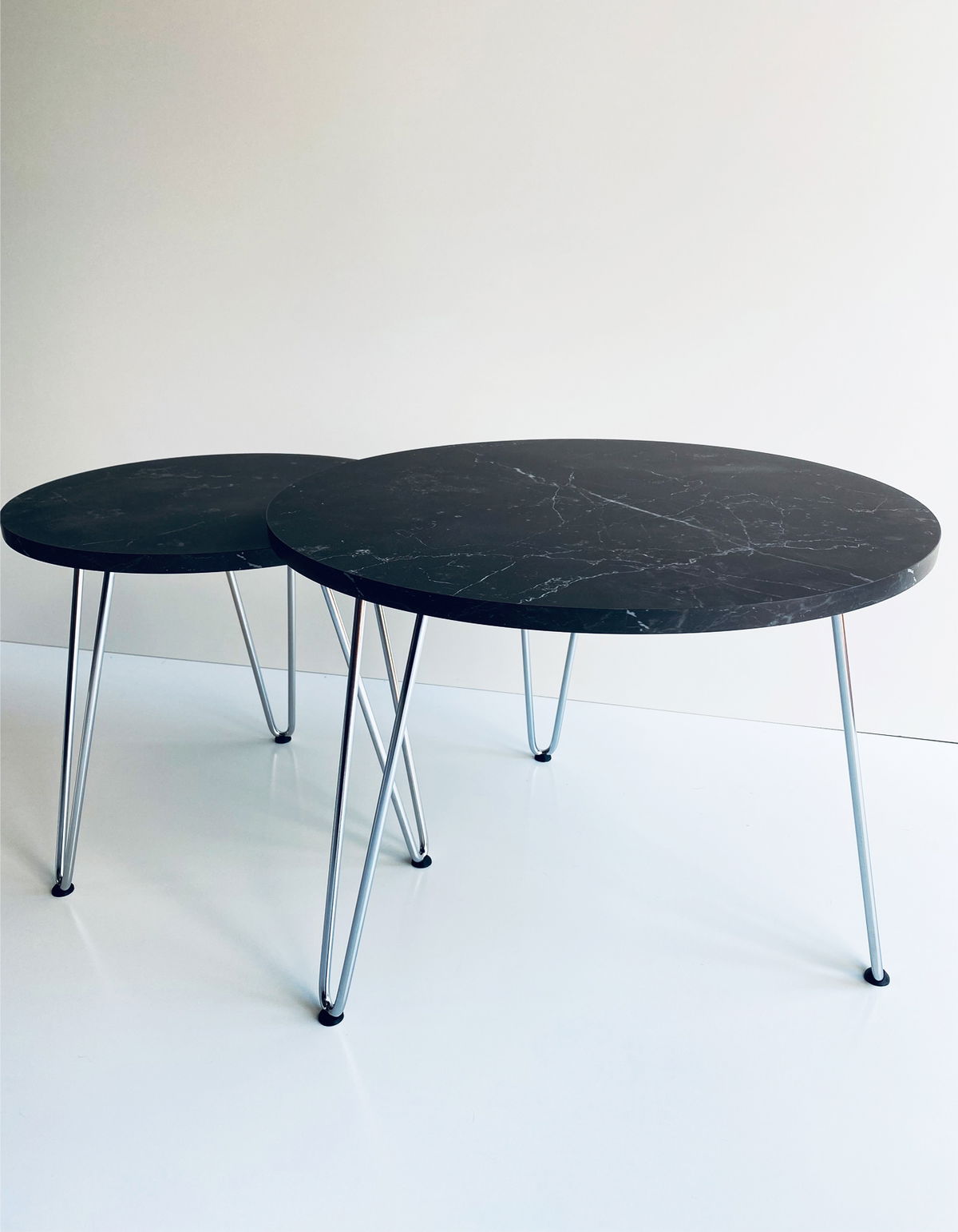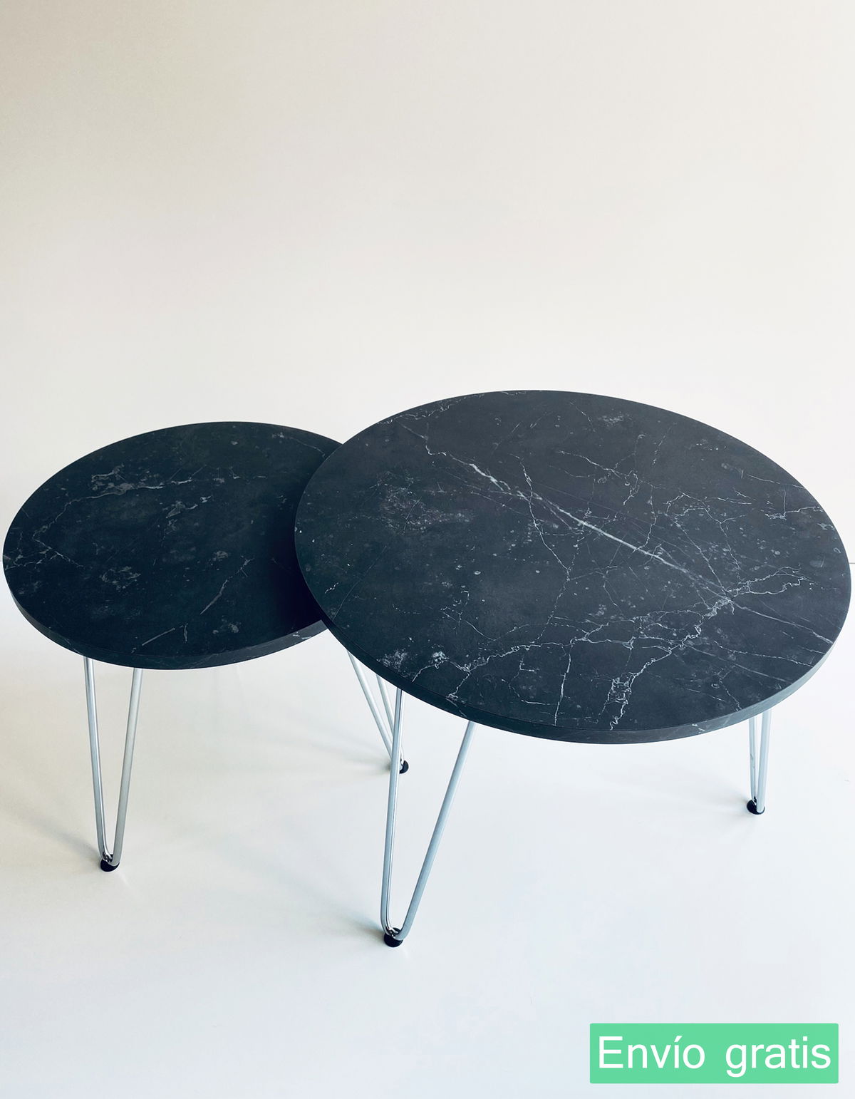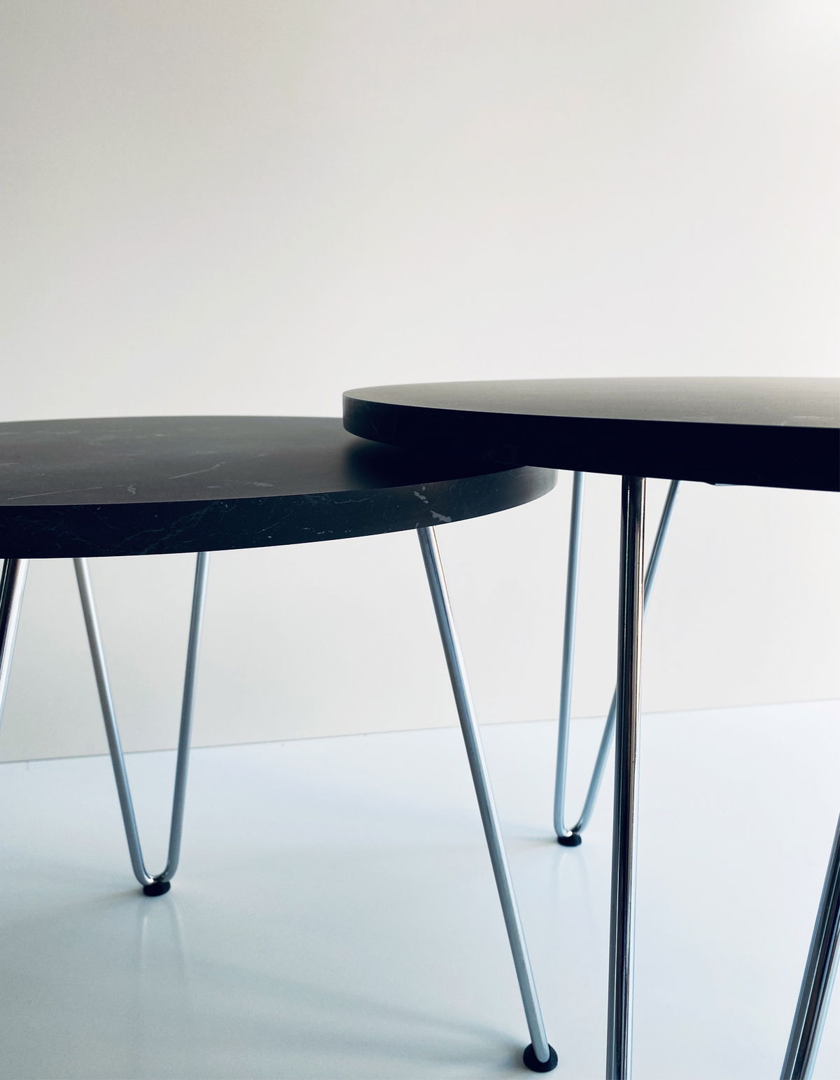 ° 2 Mesas de arrime / nido, circular con patas Hairpin Cromadas (no es pintura, es Cromo, uno de los mejores tratamientos superficiales que puede recibir un metal).
