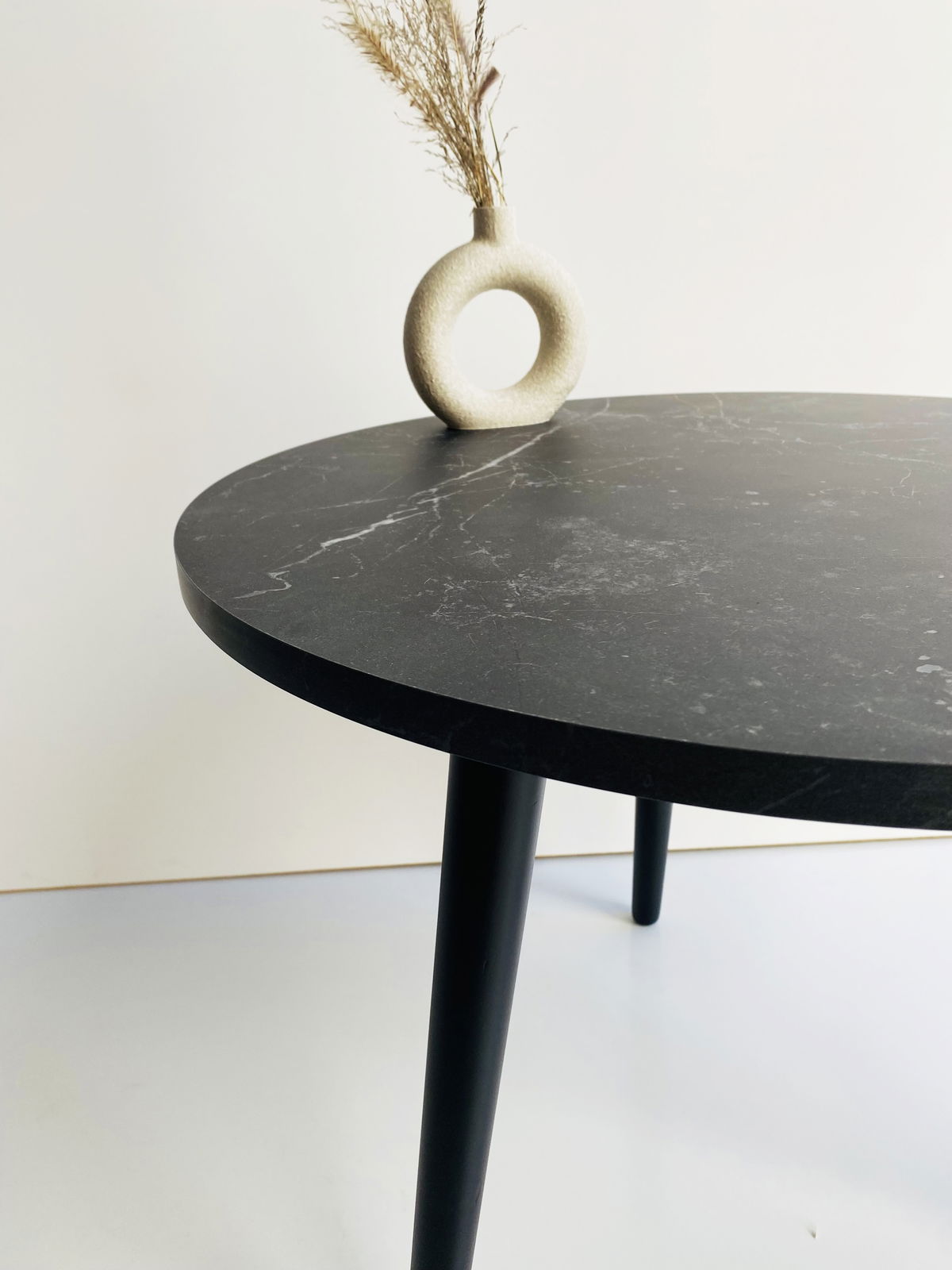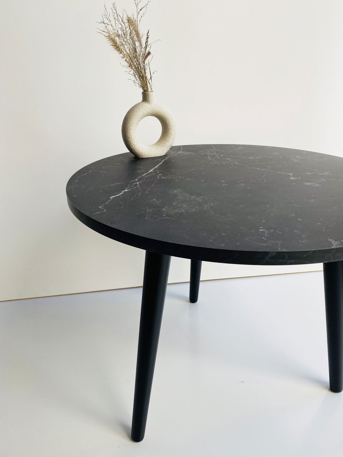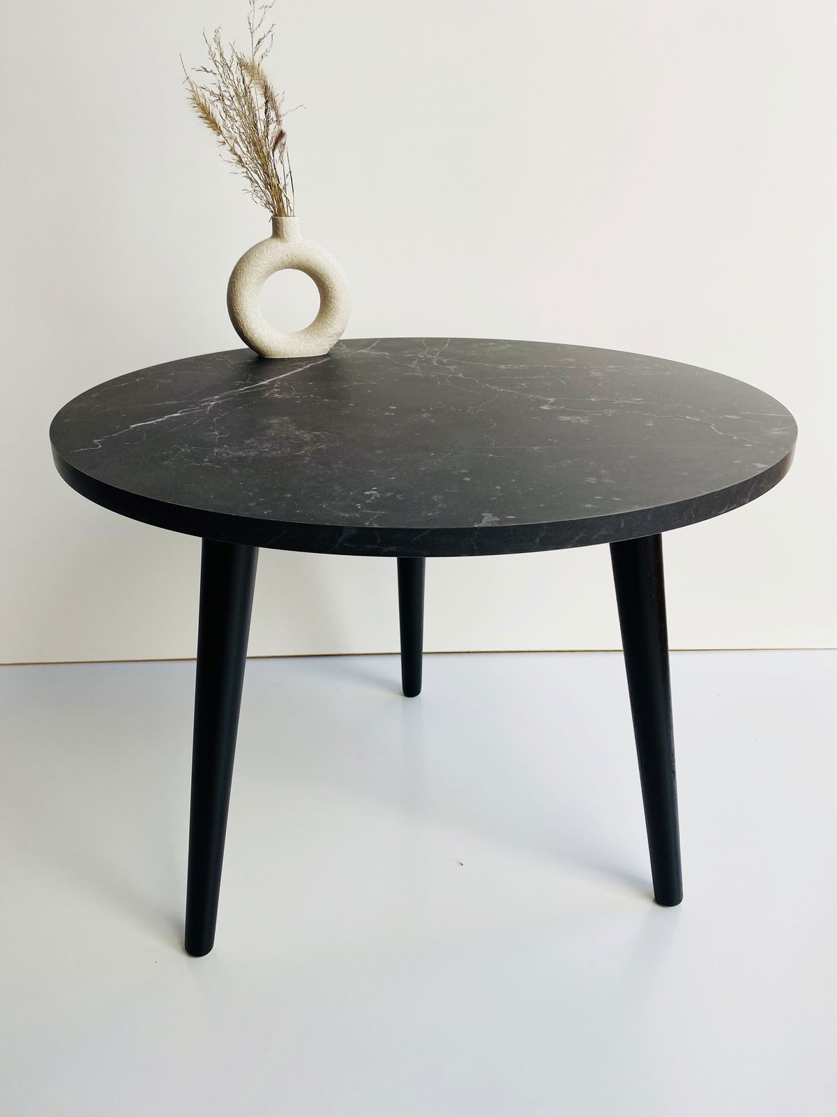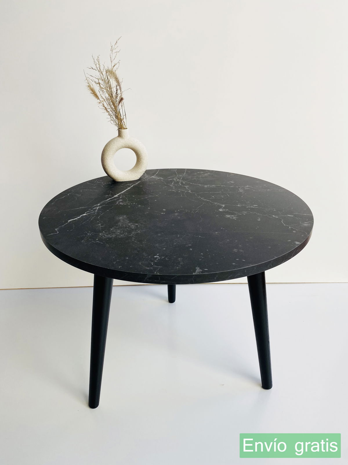 ° Mesa Ratona circular con patas de madera laquedas color negro.