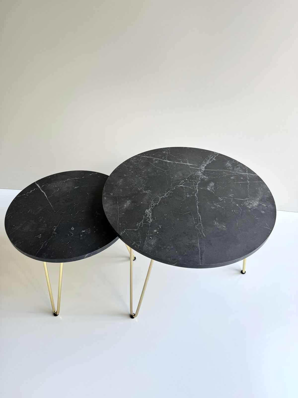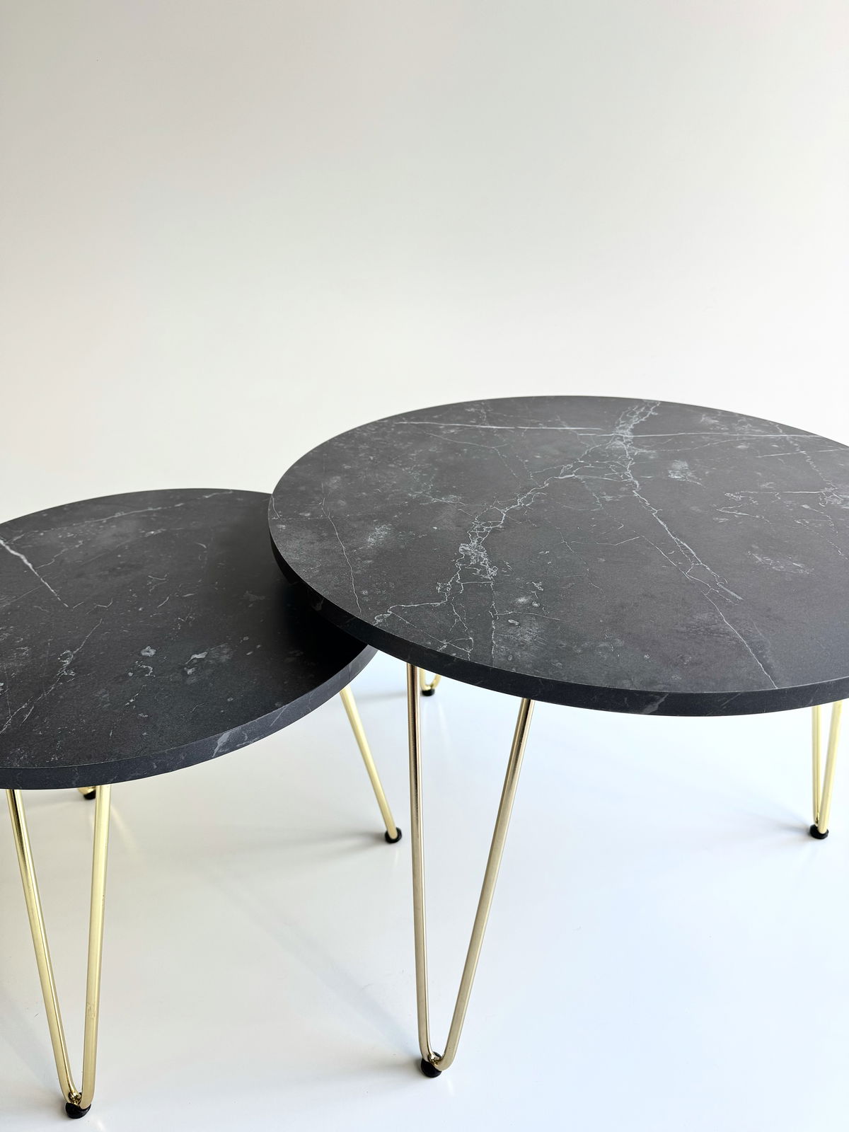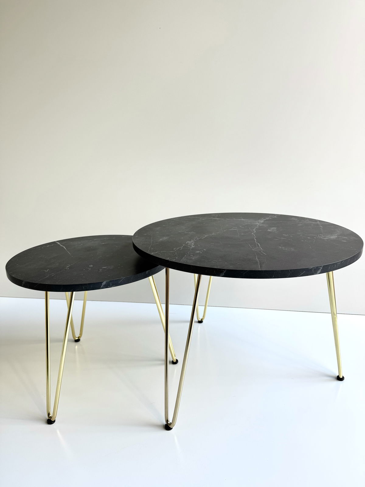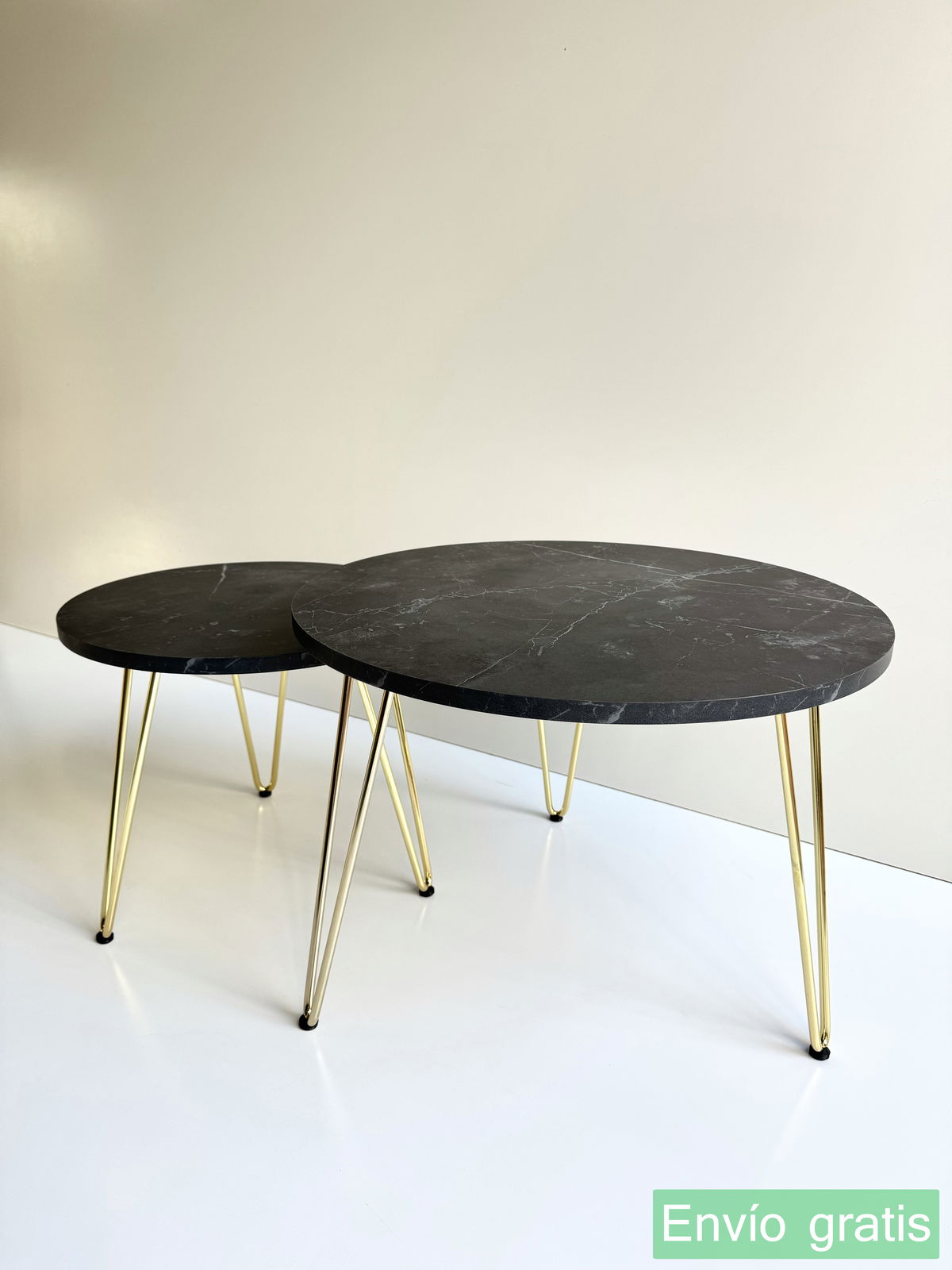 ° 2 Mesas de arrime / nido, circular con patas Hairpin Oro (no es pintura,, tiene uno de los mejores tratamientos superficiales para llegar a ese color brillante).